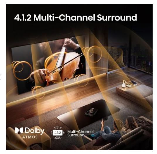 Stranski zvočniki, zadnji nizkotonci in navzgor usmerjeni zvočniki se združijo v večkanalno izkušnjo 4.1.2. Uživajte v globini zvoka od zgoraj in okoli vas, brez zapletenih nastavitev. Le čist, poglobljen zvok v popolni harmoniji z vašimi vizualnimi učinki.